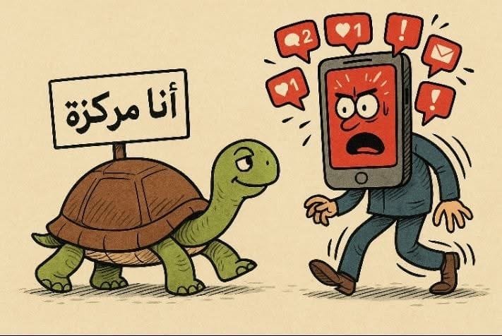 السلحفاة تسير ببطء، نعم، لكنها تعلم هدفها، تركز، لا تُقاطع رحلتها كل خمس دقائق لتتفقّد إشعارات، ولا تصرخ فجأة: “أوه! نسيت أشحن بطاريتي!”
