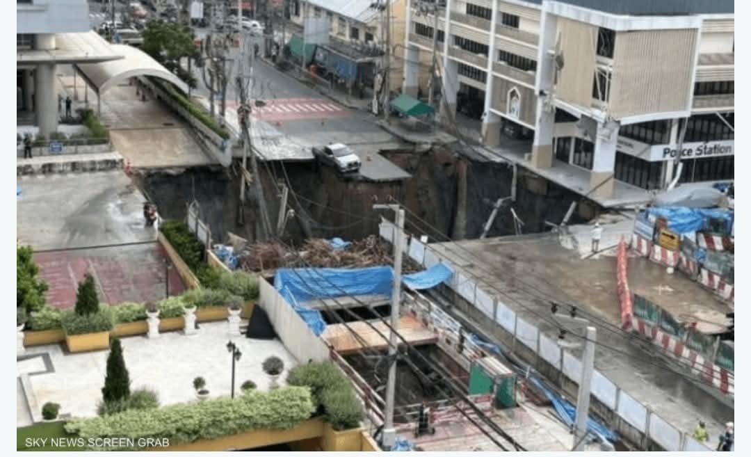 شهدت العاصمة التايلاندية بانكوك، الأربعاء، انهيارا مفاجئا لطريق رئيسي، ما أدى إلى تشكل حفرة هائلة بعمق يصل إلى 50 مترا.