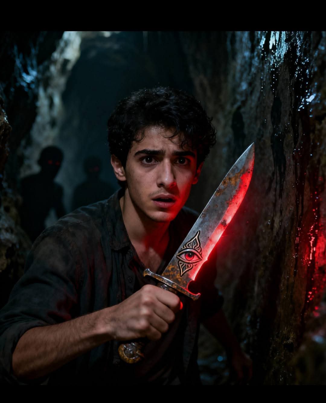 غرز عادل الخنجر في كفّه. تدفّق الدم وسقطت قطراتٌ على الرموز، التي اشتعلت بنورٍ أحمرَ صارخ. ثم انفتح الجدار فجأة كفمٍ هائل، وابتلعه في ظلامٍ أبديٍّ مصحوبٍ بصوتٍ واحدٍ فقط، صوت الكهف الواثق “لقد دخلت الدائرة… ولم يعد في وسعك العودة.”