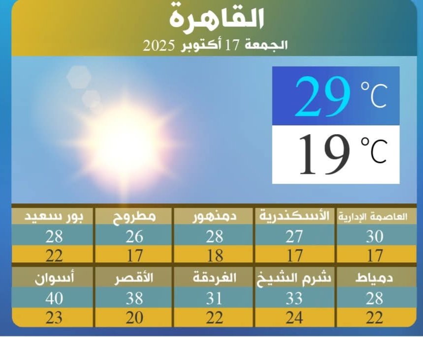 يسود اليوم الجمعة طقس حار نهاراً على القاهرة الكبرى والوجه البحرى وجنوب سيناء وشمال الصعيد مائل للحرارة على السواحل الشمالية شديد الحرارة على جنوب الصعيد معتدل الحرارة على فى أول الليل مائل للبرودة آخر الليل والصباح الباكر
