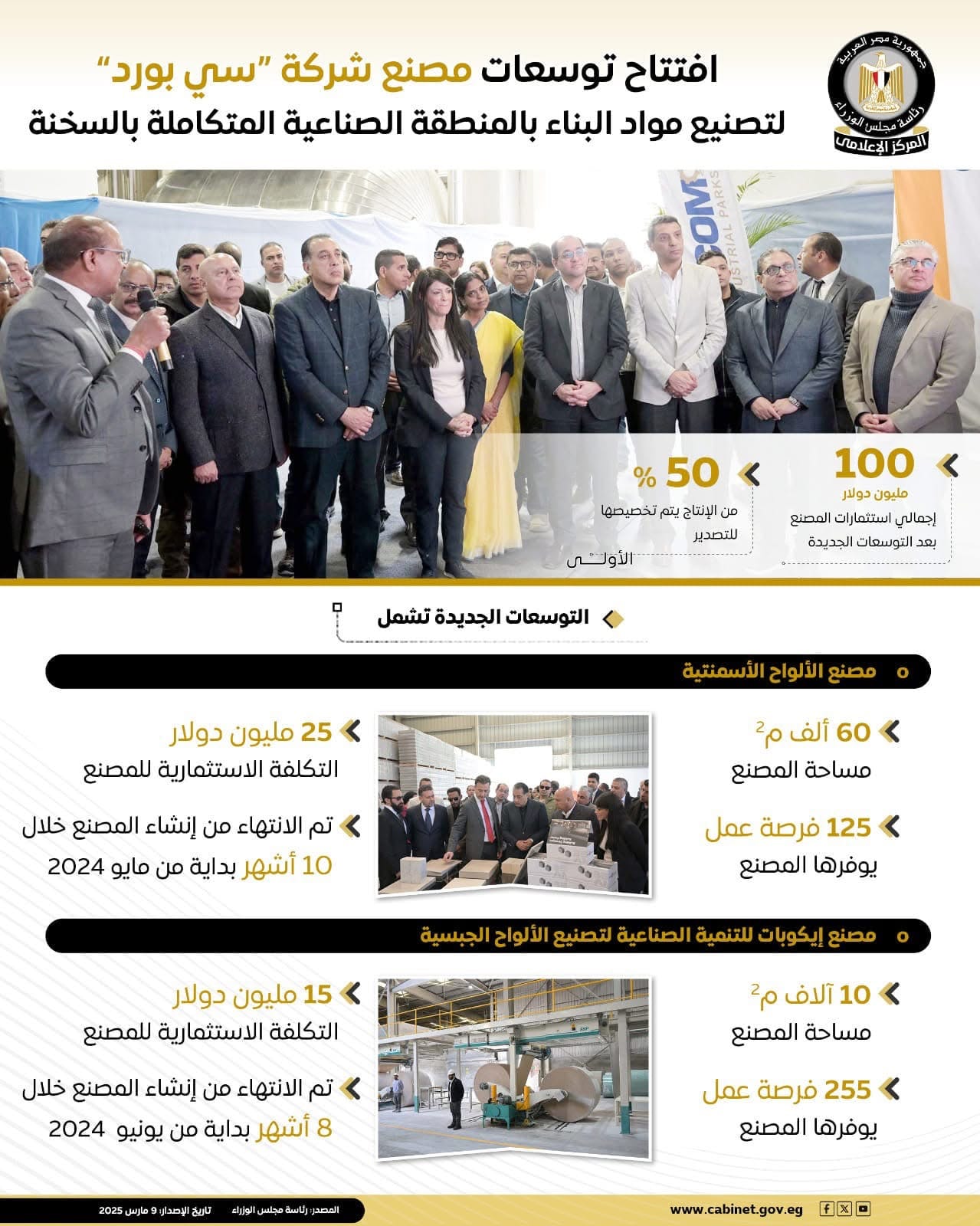افتُتحت توسعات جديدة بمصنع شركة “سي بورد” المتخصص في تصنيع مواد البناء، بالمنطقة الصناعية المتكاملة بالسخنة، بحجم استثمارات إجمالي يبلغ 100 مليون دولار، حيث يتم تصدير 50% من الإنتاج إلى الأسواق الخارجية.