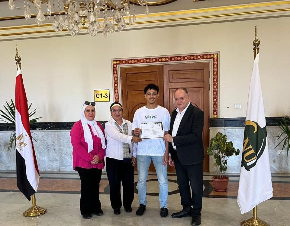 وقام د. محمد العطار نائب رئيس جامعة القاهرة الأهلية للشئون الأكاديمية، ود.هبة نوح نائب رئيس جامعة القاهرة للفرع الدولي، بتكريم الطالب سيف أحمد الشحات تقديرًا لتميزه الرياضي .