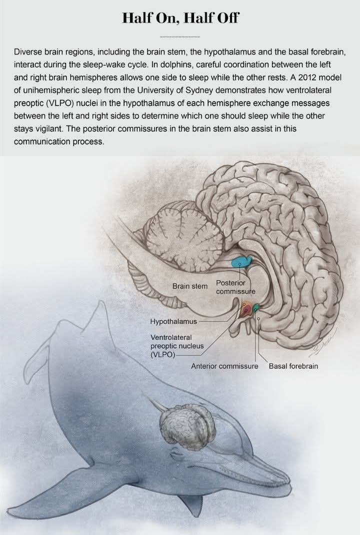 • سجلت تخطيطـات الدماغ (EEG) للدلافين تكرار حالات حيث تظهر موجات بطيئة في نصف كرة واحدة بينما تكون الأخرى أكثر نشاطاً، ممهِّدةً لتناوب فترات الراحة بين الجانبين. هذا النمط يمكّن الدلافين من الحفاظ على وظائف حيوية ضرورية (التنفّس الطوعي، الحركة، اليقظة).