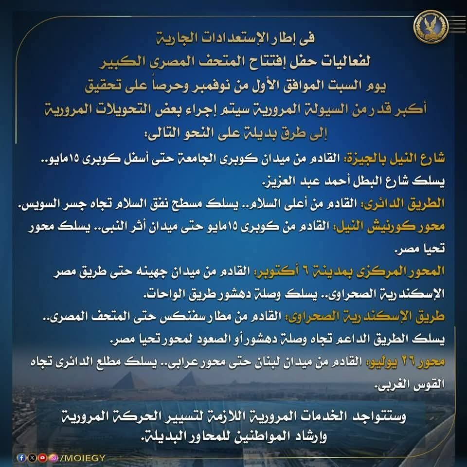 وفي إطار الاستعدادات الجارية لتأمين الحدث وضمان السيولة المرورية، أعلنت وزارة الداخلية عن تنفيذ عدد من التحويلات المرورية على المحاور والطرق المؤدية إلى منطقة المتحف المصري الكبير، اعتبارًا من صباح السبت، وتشمل شارع النيل بالجيزة، والطريق الدائري، ومحور روض الفرج، ومحور 26 يوليو، ومحور 6 أكتوبر، وطريق الإسكندرية الصحراوي، إضافة إلى المحور المركزي بمدينة 6 أكتوبر.