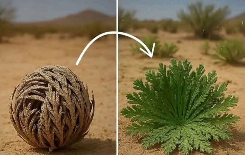 وعندما تهطل الأمطار أو تصلها رطوبة كافية، تبدأ النبتة تدريجياً بامتصاص الماء وإعادة تنشيط خلاياها، فتتفتح أوراقها وتتحول إلى لون أخضر زاهٍ خلال ساعات قليلة فقط، في مشهد مذهل يُشبه عودة الحياة إلى جسدٍ ميت.