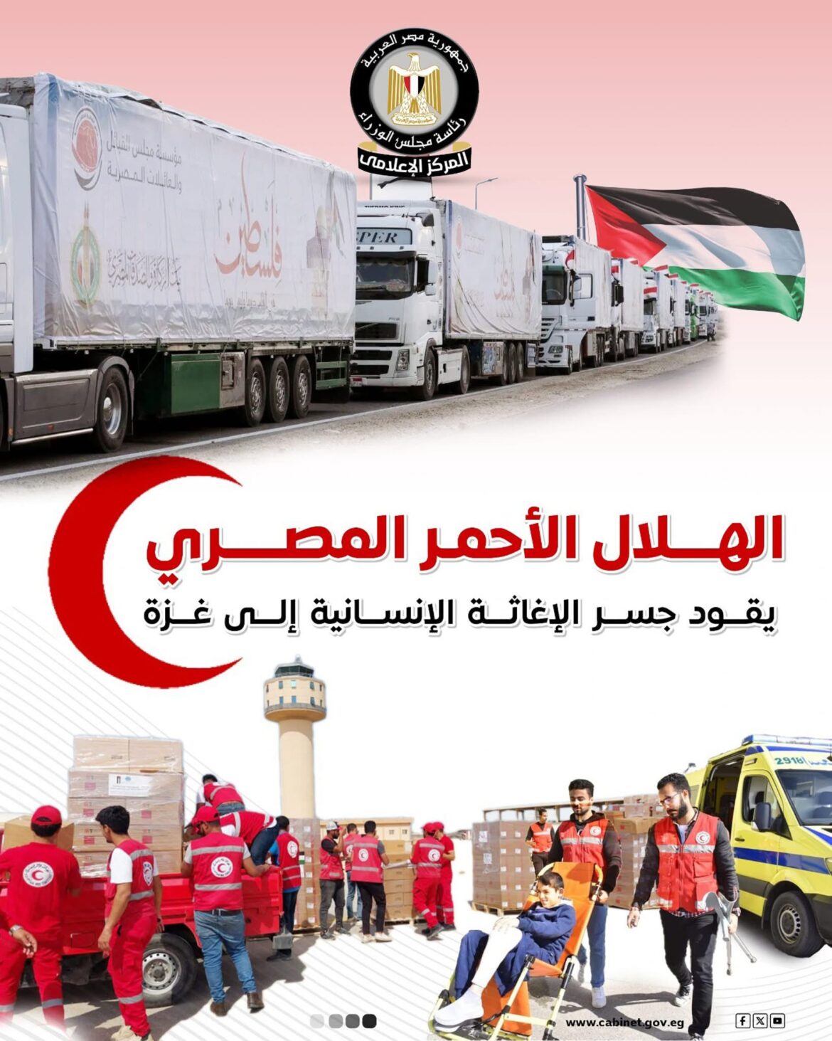 نشر المركز الإعلامي لمجلس الوزراء عددًا من الإنفوجرافات عبر صفحاته الرسمية على مواقع التواصل الاجتماعي، استعرض من خلالها حجم الجهود المصرية المتواصلة لدعم أهالي قطاع غزة، بقيادة الهلال الأحمر المصري الذي يتصدر المشهد الإنساني كذراع الدولة في إدارة وتنسيق عمليات الإغاثة.