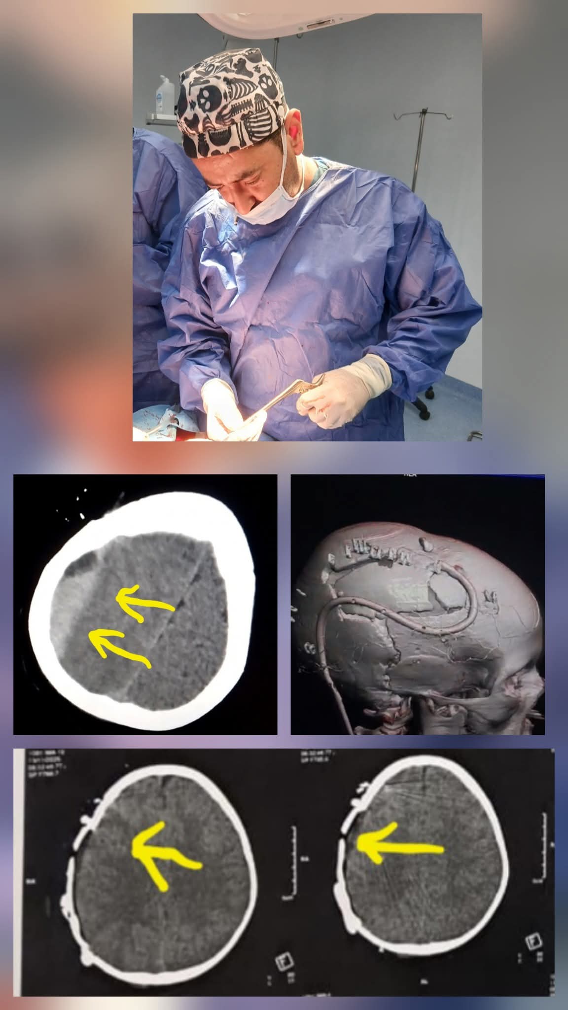 ثم نُقل مباشرة إلى العمليات حيث أجرى الفريق الطبي فتحات بعظام الجمجمة تفريغ النزيف خارج الأم الجافية كي الأوردة والشرايين المسببة للنزيف إعادة تثبيت العظام المكسورة وضع درنقة تحت فروة الرأس لضمان تصريف أي تجمع دموي بعد الجراحة