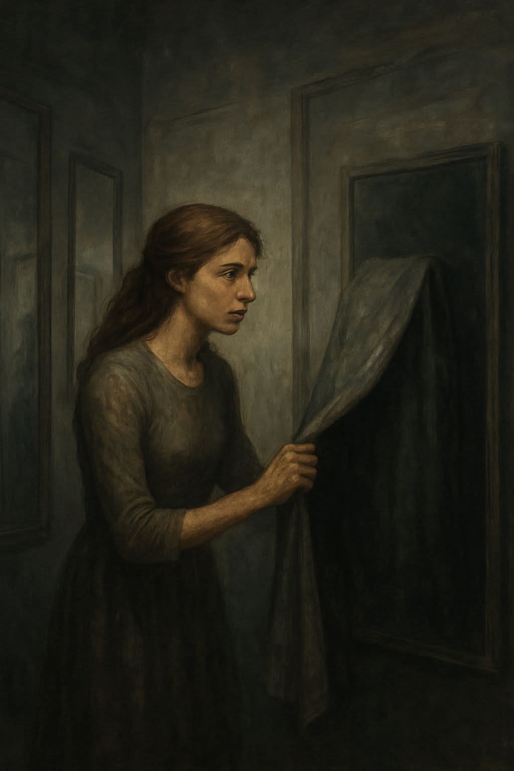 في الليلة الرابعة، بدأت المرايا تتحرك كأنها تراقبني. رأيتُ انعكاسًا يشبهني، لكنه أكبر سنًا وأتعَب. كلما حاولتُ الاقتراب منه يختفي. كانت المرآة المغطاة ترتجف، كأن ما تحتها يحاول الخروج. لم أجرؤ على لمسها.