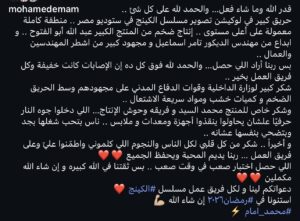“قدر الله وما شاء فعل والحمد لله على كل شيء. حريق كبير في لوكيشن تصوير مسلسل الكينج في ستوديو مصر… والحمد لله فوق كل ده إن الإصابات كانت خفيفة وكل فريق العمل بخير.”