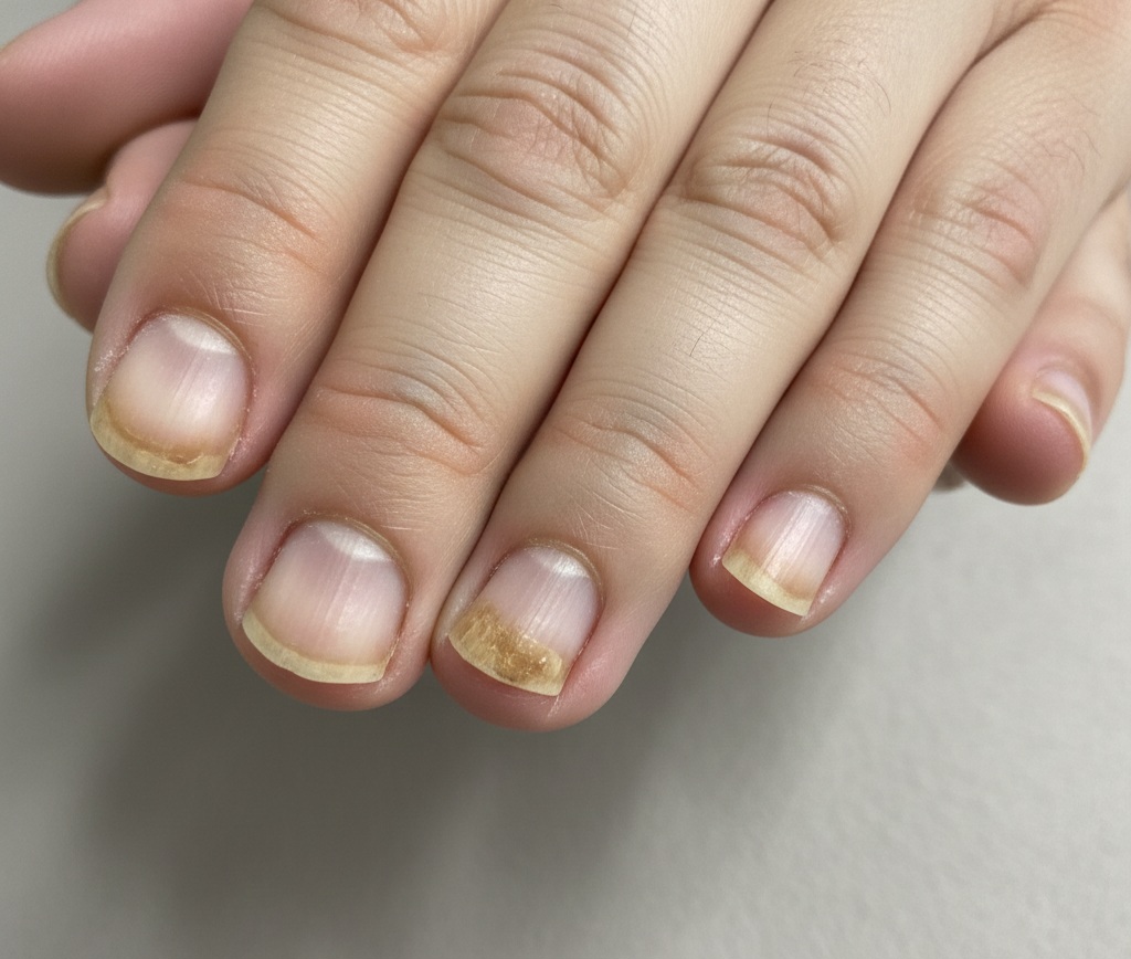 زيادة سماكة أظافر اليدين أو القدمين، حيث تظهر طبقات متراكمة غالبًا بلون مائل إلى الأصفر، وقد تسبب ألمًا إذا انغرست في الجلد.