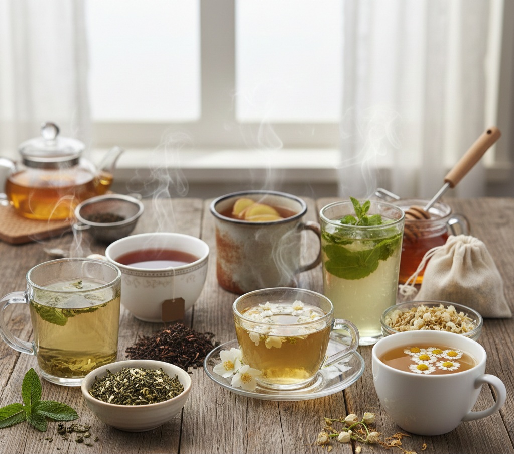 تهدئة الجهاز الهضمي والمزاج: أنواع الشاي العشبي مثل الزنجبيل، النعناع، البابونج، والياسمين تساعد على الاسترخاء وتحسين النوم.