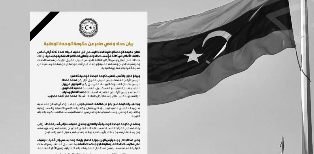 أعلنت حكومة الوحدة الوطنية الليبية، مساء اليوم، حالة الحداد الرسمي في كافة أنحاء البلاد لمدة ثلاثة أيام، مع تنكيس الأعلام فوق المباني والمؤسسات الحكومية، وذلك برحيل رئيس الأركان العامة للجيش الليبي، الفريق أول ركن محمد الحداد، ومرافقيه الذين وافتهم المنية إثر حادث أليم في الأراضي التركية.