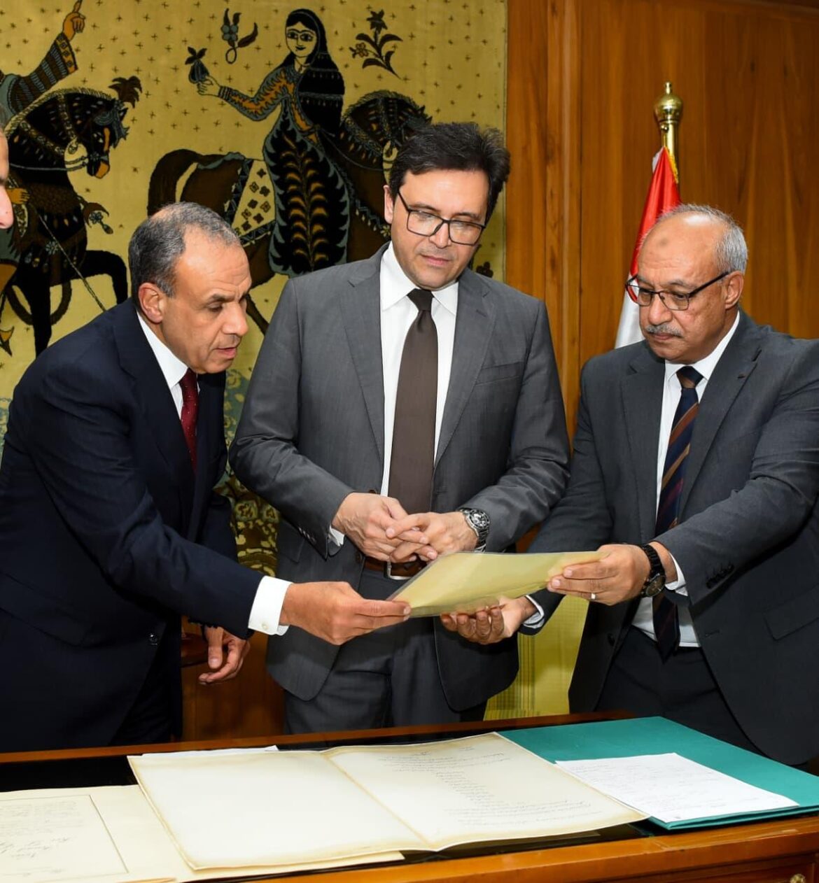 وخلال الجولة، تسلم الوزير عبد العاطي مجموعة من الوثائق والمستندات والخرائط الخاصة بوزارة الخارجية، والتي تم الانتهاء من ترميمها داخل معامل دار الكتب، في إطار التعاون المشترك بين الجانبين في مجالات الترميم والرقمنة. وشملت هذه المجموعة 13 خريطة، و22 وثيقة، و43 اتفاقية أُبرمت خلال عهد نظارة الخارجية ووزارة الخارجية في الحقبة الملكية، تمهيدًا لعرضها ضمن مقتنيات متحف وزارة الخارجية المزمع افتتاحه قريبًا بمقر الوزارة.