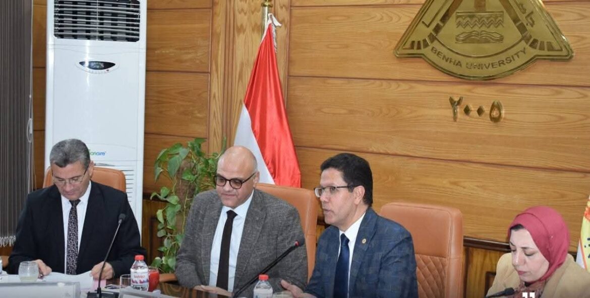 عقد مجلس جامعة بنها اجتماعه برئاسة الدكتور ناصر الجيزاوي رئيس جامعة بنها، وبحضور المهندس أيمن عطية محافظ القليوبية، ، والدكتورة جيهان عبد الهادي نائب رئيس الجامعة لشئون الدراسات العليا والبحوث، والدكتور طه عاشور نائب رئيس الجامعة لشئون خدمة المجتمع وتنمية البيئة، والسادة أعضاء مجلس الجامعة.