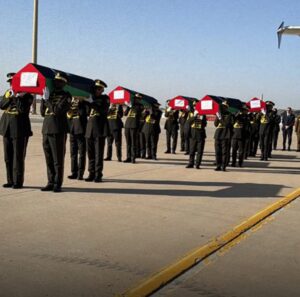 وصلت صباح اليوم الطائرة الرئاسية إلى مطار طرابلس الدولي، محمّلة بجثامين رئيس الأركان الفريق أول ركن محمد الحداد ورفاقه، وذلك عقب مراسم التأبين التي أقيمت في قاعدة مرتدة العسكرية.
