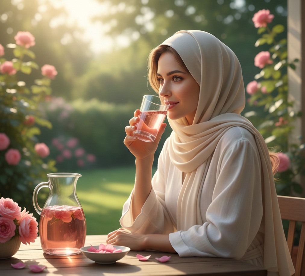 ترطيب الجسم: شرب ماء الورد مع الماء يساهم في ترطيب الجسم وتعويض السوائل بشكل لطيف.
