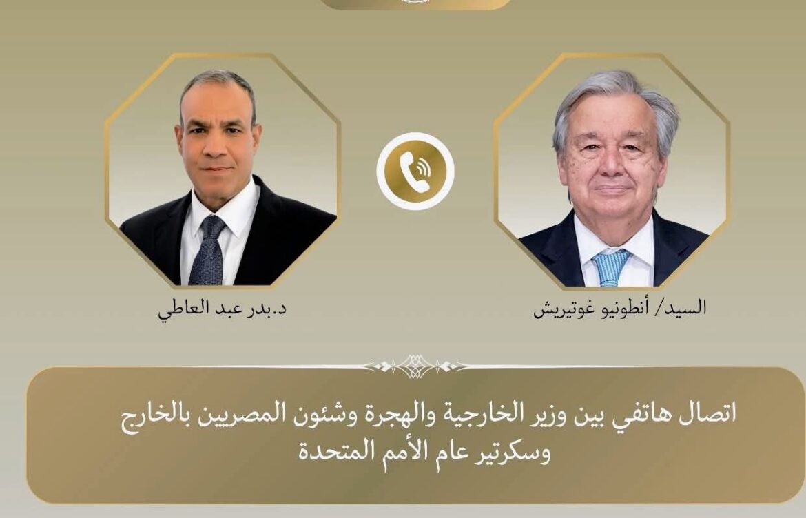 أجرى الدكتور بدر عبد العاطي، وزير الخارجية والهجرة وشؤون المصريين بالخارج، اتصالًا هاتفيًا اليوم الخميس مع الأمين العام للأمم المتحدة أنطونيو جوتيريش، حيث بحث الجانبان آخر التطورات في الأوضاع الإقليمية.