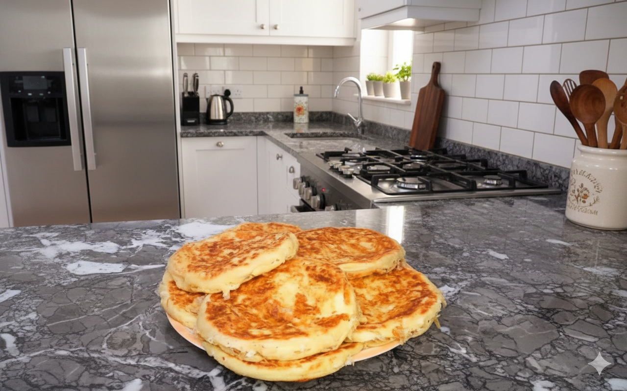يُطهى الخبز في مقلاة ساخنة على نار متوسطة حتى ينضج ويأخذ لونًا ذهبيًا من الجهتين.