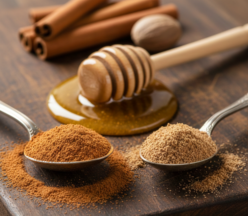 يُعرف العسل بخصائصه المضادة للبكتيريا والمرطبة، بينما تُستخدم القرفة وجوزة الطيب تقليديًا لخصائصهما المضادة للالتهاب، لكن يجب استخدامهما بحذر شديد مع الأكزيما.