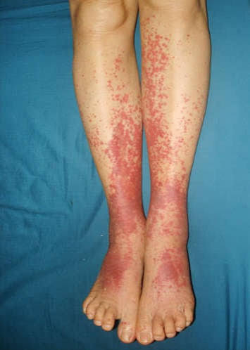 * الطفح الجلدي المميز: بقع أرجوانية بارزة (يمكن لمسها) لا تختفي عند الضغط عليها، وتتركز غالباً في الساقين.