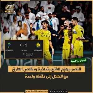 وافتتح كريستيانو رونالدو التسجيل في الدقيقة 18، قبل أن يعزز أيمن يحيى النتيجة بالهدف الثاني في الدقيقة 78، ليحصد “العالمي” ثلاث نقاط ثمينة ويواصل مطاردة الهلال المتصدر.