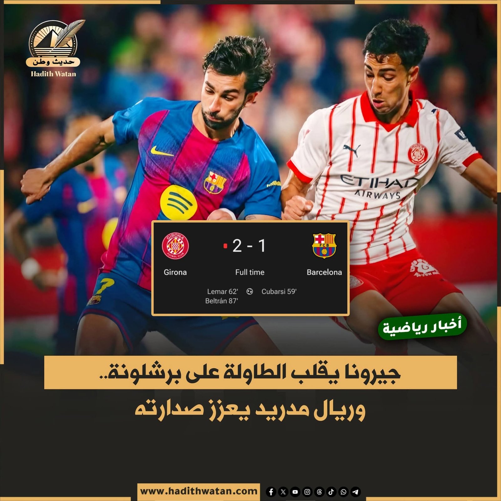 وبهذا الفوز، وجه جيرونا ضربة قوية لبرشلونة في سباق المنافسة على اللقب، فيما واصل ريال مدريد تصدره جدول الترتيب بفارق نقطتين.