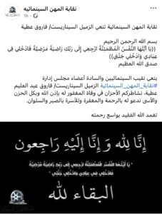 وأضاف البيان: “ينعى نقيب السينمائيين وأعضاء مجلس إدارة النقابة الزميل السيناريست فاروق عطية، ونشاطركم الأحزان في وفاة المغفور له بإذن الله، وندعو له بالرحمة والمغفرة، ولأسرته بالصبر والسلوان. تغمد الله الفقيد بواسع رحمته”.